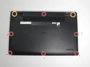 Ослабьте два крепежных винта 1 мм (оранжевые круги на изображении) в задних углах нижней крышки.