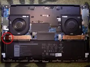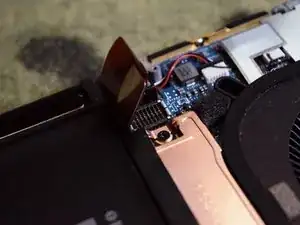 Вставьте палец в пластиковую петлю, прикрепленную к разъему батареи, и потяните крепко от материнской платы.