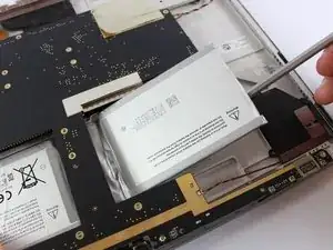 С помощью пластиковой лопатки аккуратно подденьте аккумулятор. Аккумулятор проходит под материнской платой. Сдвиньте его вправо, чтобы освободить.