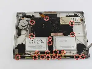 Используйте отвертку T4 Torx, чтобы вынуть 24 винта. Два маленьких винта на концах кронштейна платы Wi‑Fi/камеры — это T3 Torx.