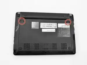 Найдите переключатели блокировки батареи в верхних углах снизу устройства, указанные красными кружками.