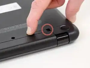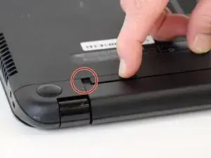 Поместите палец на левую защелку и сдвиньте ее к центру ноутбука.