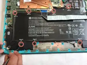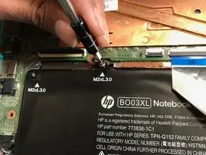 Удалите семь винтов M2xL3.0 вокруг батареи с помощью отвертки Philips #00.