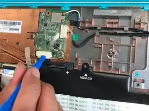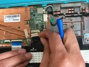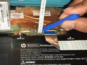 Приподнимите черную пластиковую защелку, используя пластиковый инструмент, ZIF разъема, который удерживает кабель клавиатуры на месте.