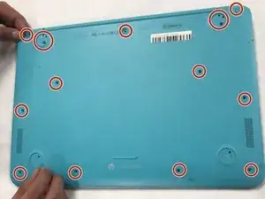 Удалите тринадцать винтов по 5.7 мм на задней стороне ноутбука с помощью отвертки Philips #00.