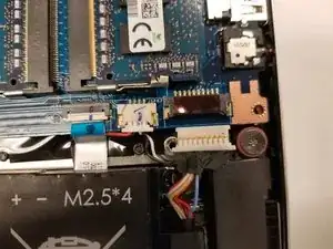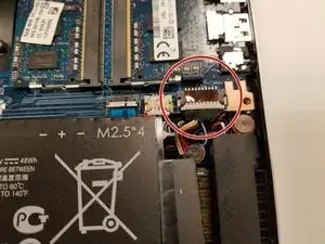 Удалите кабель, соединяющий батарею с материнской платой, схватив за ткань и потянув вниз.