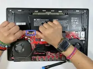 Осторожно отключите разъем батареи, который соединен с материнской платой, плавно перемещая его в сторону батареи двумя пальцами.