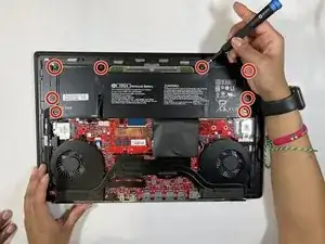 Используйте отвертку J00 JIS, чтобы удалить восемь винтов, крепящих батарею.