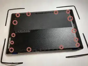 Используйте лопатку или пальцы, чтобы снять тонкие резинки, прикрепленные к краям ноутбука.