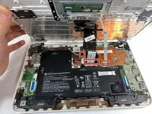 Используя пинцет или пластиковую лопатку, отсоедините два соединителя кабелей, соединяющих батарею с материнской платой.