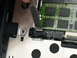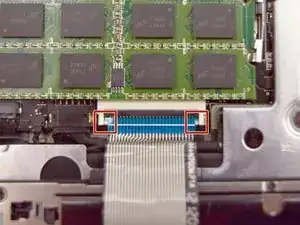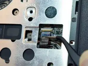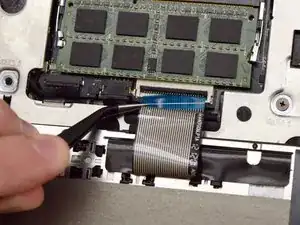 Найдите небольшой шлейф тачпада и используйте инструмент для поддевания, чтобы приподнять чёрную защёлку на разъёме.