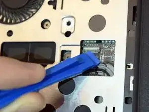 Вставьте пластиковый инструмент для поддевания в зазор между клавиатурой и корпусом ноутбука.
