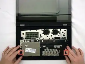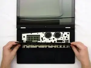 Снимите рамку клавиатуры с ноутбука. Рамка закреплена на шасси 10 пластиковыми защёлками по периметру, которые можно освободить пластиковым инструментом для поддевания.