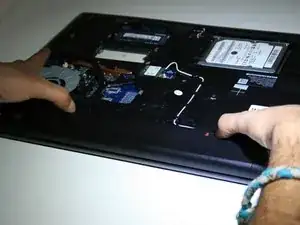 Нажмите на противоположной стороне, чтобы освободить батарею от ноутбука, затем извлеките ее.