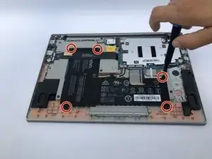 Удалите десять винтов Torx T5 длиной 1.5 мм с задней стороны ноутбука.
