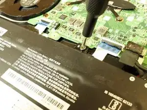 Используя пинцеты, отключите батарею от материнской платы ноутбука, потянув за кабель, который ее соединяет.