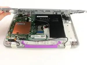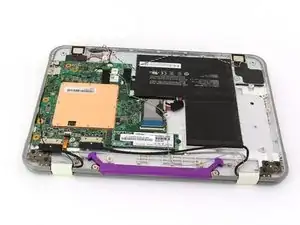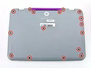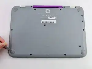 В этом руководстве подробно описано, как безопасно снять батарею с ноутбука One Education Infinity. Модельный номер Infinity — A03. Это устройство можно узнать по его темно-серому корпусу, светло-серому внутреннему оформлению, пурпурной ручке и поворотной камере над экраном.