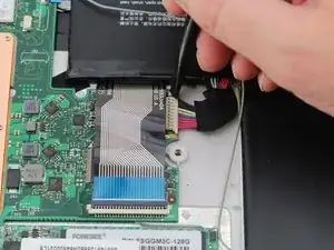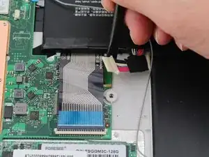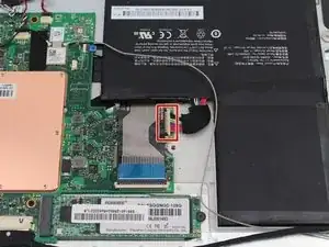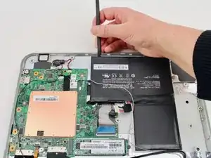 Осторожно покачайте кабель батареи вправо и извлеките его из порта с помощью пластиковой лопатки.