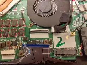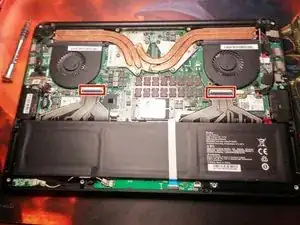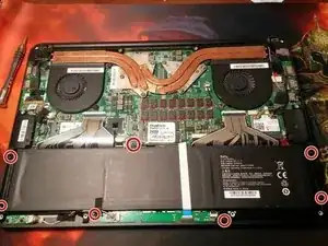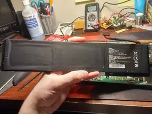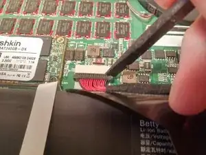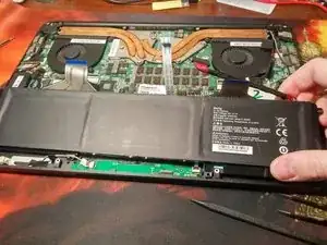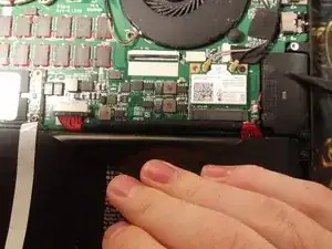 Удалите батарею, потянув вверх со стороны, ближайшей к материнской плате