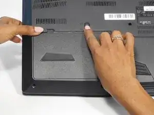 Приложив усилие, сдвиньте кнопку разблокировки слева вправо, чтобы извлечь батарею из отсека.