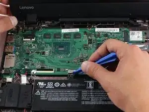 Отсоедините кабель батареи от материнской платы, поддев край пластиковым инструментом между чёрным разъёмом кабеля и серебристой гнездовой частью на плате.
