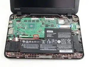 Поднимите клавиатуру и отложите её с задней панели, обнажив материнскую плату и батарею.