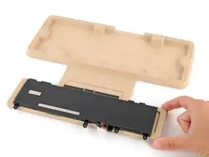 Снимите картонный лоток с новой батареей внутри и осторожно откройте лоток.
