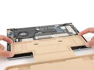 Разместите ноутбук так, чтобы задний край (с петлёй экрана) был к вам ближе.