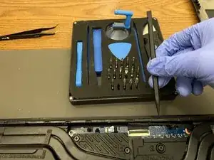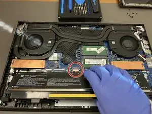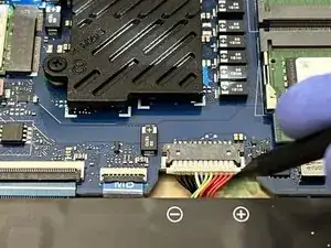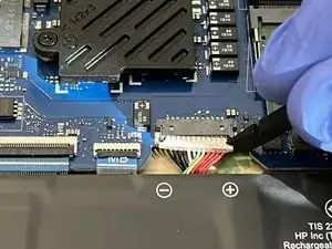 Используйте лопатку, чтобы вставить 12-контактный силовой разъём батареи в материнскую плату.
