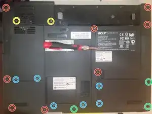 Снимите все крышки доступа. Учтите короткий винт, скрытый под жёстким диском, и винт средней длины под крышкой доступа к процессору. Также отсоедините антенны беспроводной сети.