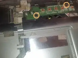 Сразу справа от этих винтов снимите два коротких винта, фиксирующие плату кнопки питания.