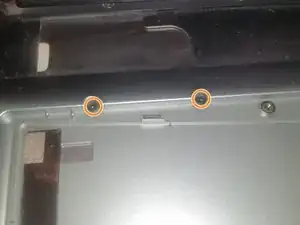 Снова переверните ноутбук и откройте его почти полностью, чтобы получить доступ к винтам, фиксирующим петли. Снимите эти винты.