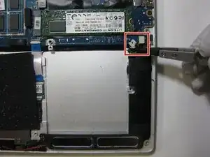 Используйте пластиковую лопатку, чтобы осторожно отсоединить разъём батарейки от порта, медленно поднимая разъём с каждой стороны до его освобождения.