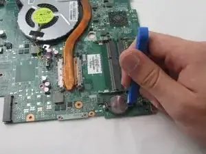 Вставьте синий пластмассовый инструмент для вскрытия в корпус батарейки CMOS вдоль паза в направлении центра материнской платы. Батарейка должна сдвинуться влево.