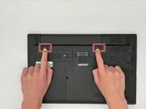 На задней панели ноутбука находятся два сдвижных замка для батареи. Они расположены прямо под батареей и обозначены маленькой иконкой замка с каждой стороны.