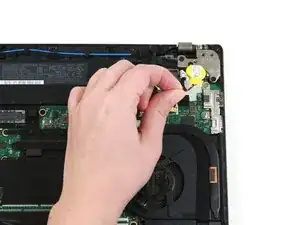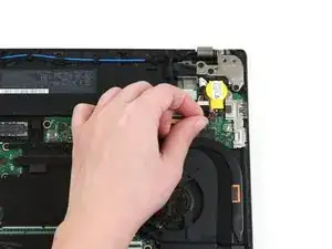 Возьмитесь за провод, прикреплённый к батарейке-таблетке, и поднимите его из ноутбука.