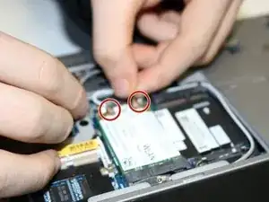 Определите два пина, соединяющих беспроводной адаптер с материнской платой. (Беспроводной адаптер будет помечен как WLAN.)