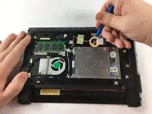 С закрытой крышкой нетбука переверните его верхней стороной вниз. Вставьте наконечник пластикового инструмента в угол задней крышки доступа, пока угол не отщелкнется.