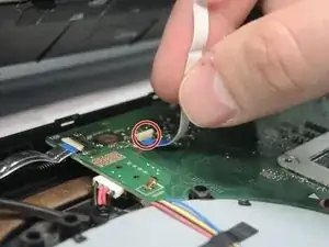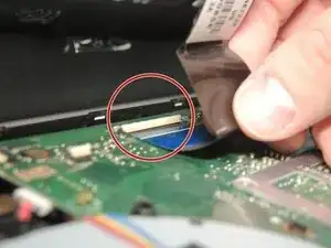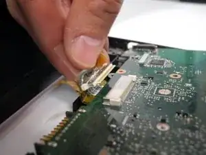 Отогните скотч, который крепит кабель экрана ноутбука. Не рекомендуется отсоединять кабель на этом этапе, так как есть риск его повредить.