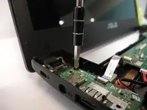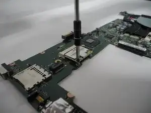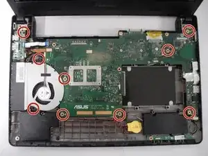 С помощью крестовой отвертки №1 выкрутите все винты, крепящие материнскую плату к корпусу ноутбука.