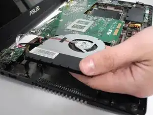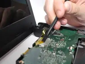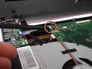 С помощью пластиковой лопатки подденьте и поднимите вентилятор с корпуса ноутбука, это также приподнимет материнскую плату.