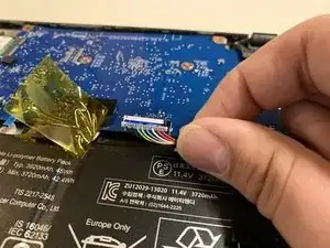 Верните антистатическую ленту на разъёмы батареи и клавиатуры.