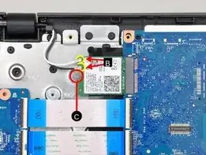 Удалите винт, удерживающий беспроводную карту. (обозначено «C»)