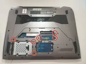 Используя крестовую отвёртку Phillips #0, удалите все двенадцать винтов 5.2 мм на задней панели ноутбука.