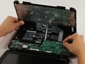 Проведите пластиковым инструментом вдоль шва между клавиатурой и нижней частью Chromebook, пока клавиатура не начнёт свободно перемещаться. Несколько защёлок выскочат.