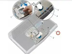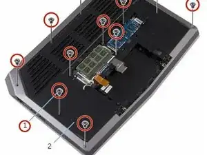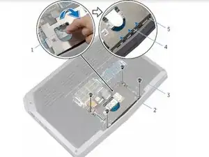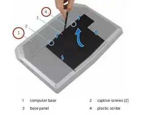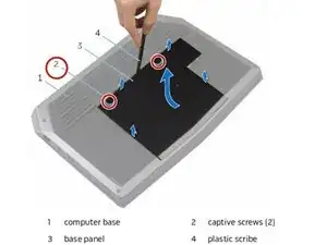 Ослабьте сохраняемые винты, которые фиксируют нижнюю панель к основанию компьютера.