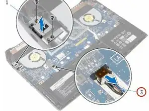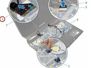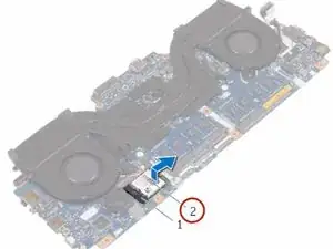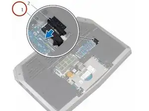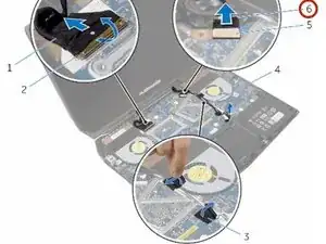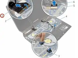 Отключите кабель разъёма адаптера питания и снимите разъём адаптера питания с системной платы.