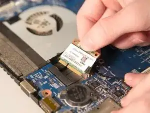 После удаления винта карта немного подскачет вверх. Выньте старую беспроводную карту из её разъёма.
