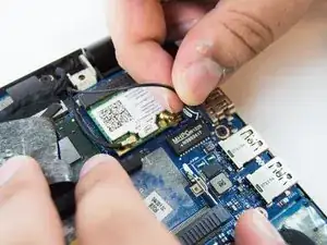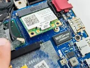 Замена беспроводной (WLAN) карты может потребоваться для устранения проблем с беспроводной сетью. Карта небольшая и имеет нежные проводки, прикреплённые к ней. Будьте осторожны при освобождении проводов и карты от системы, так как контакты деликатные и могут влиять на производительность беспроводной сети.