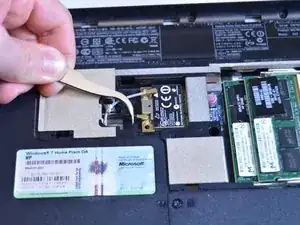 Используя пинцет, отключите серый и черный кабели от беспроводной карты.